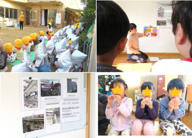 0歳から5歳まで全園児で地震の避難訓練をしました。子どもたちを安全に避難させるために、毎月、訓練を行っています。そのあとは5歳児に向けて、阪神淡路大震災のお話しをしました。話しをすすめていくと、31年前の震災の話しを保護者の方から聞いている子どもたちたちもいました。震災で学んだことを、これからも伝えていきたいと思います。最後には、防災食のクッキーを子どもたちと食べてみました。