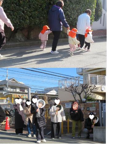 今日は各クラス打出神社に初詣に行ったり、すいか、みかん組は宮川小学校に行き「凧揚げ」をして遊びました。