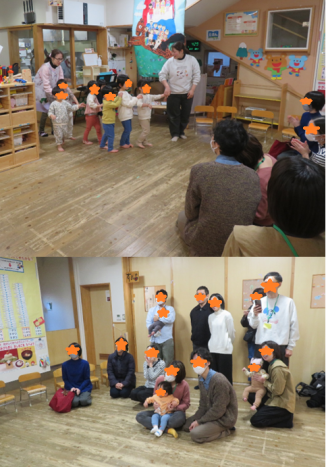 2歳児もも組の懇談会と参観がありました。保護者の「ももぐみさーん」のかけ声に元気に登場してくれたもも組のみんなでした。日頃の朝のシール貼りの様子を見てもらったり、給食の用意をする姿を見てもらったりしました。親子でオニさんのお面つくりもして、たくさんの可愛いお面が出来上がりました!子どもたちの成長の様子を見ていただけた楽しい一日になりました♪