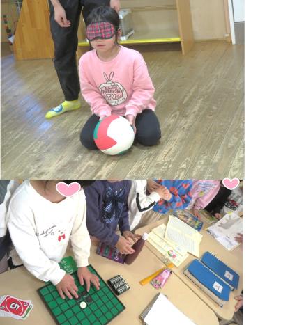 アイマスク体験、点字実演、点字絵本やおもちゃなど様々なものをみせていただきました。