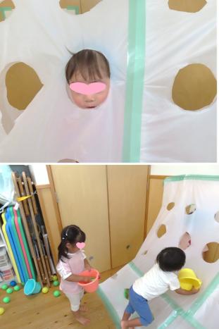 ビニールに穴をあけたところから、顔を「ばぁ~」と出したり、ボールを「ポトン!」と落としてみたり、色々な遊び方をして楽しみました♪