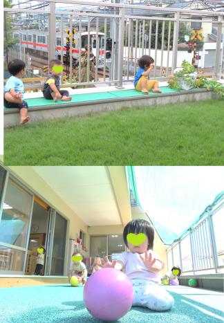 窓を開けると、電車が見え、芝生のテラスに駆け出す子ども達です。