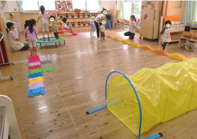 お話を聞いたり、お歌を歌った後は、テラスとお部屋を使ってサーキットを楽しみましたよ。