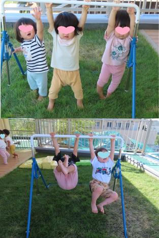 1歳児さんは、腕の力がしっかりついて、足をグイッと上げて、ブラ~ンとするのを楽しんでいますよ。