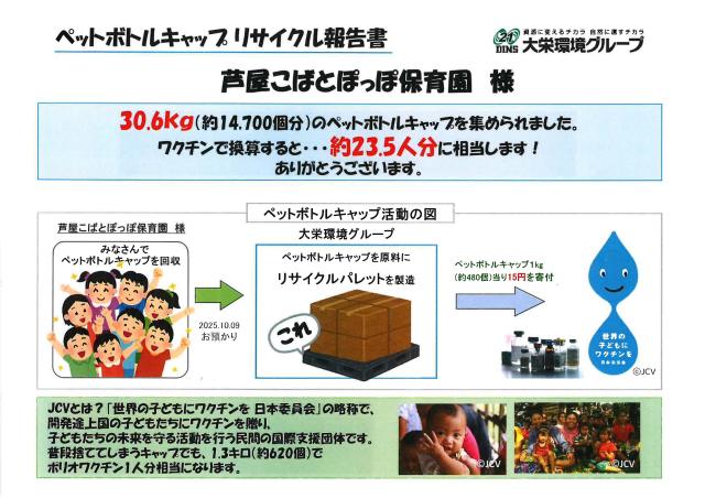 先日、大栄グループさんに送った、ペットボトルキャップの結果報告が届きました。