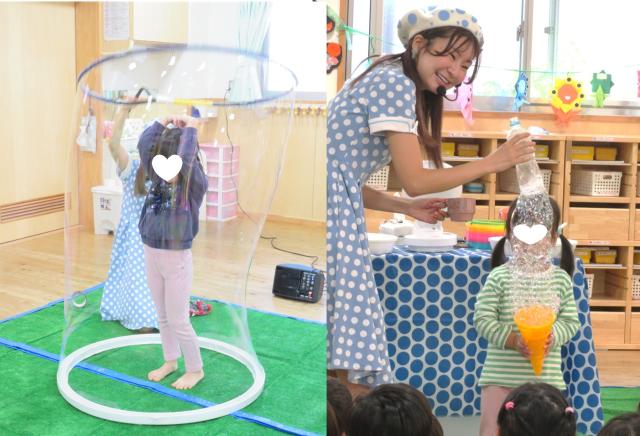 小さいシャボン玉・大きなシャボン玉・最後は、シャボン玉の中に入って不思議で楽しい体験ができましたよ☆