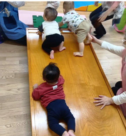 0歳児ひよこグループさんが体育あそびをしました。戸板の坂道をあんよやハイハイで登ります!