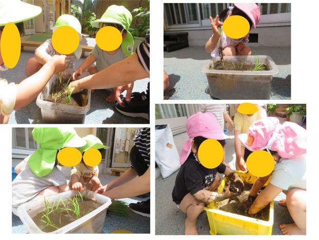 みんな一つずつ丁寧に植えてくれました。うさぎグループさんは、植えた後また抜いてみることも楽しかったようで、何度か植えた稲を抜く様子もありましたが、無事植え終わることが出来ました!美味しいお米が育ちますように♪