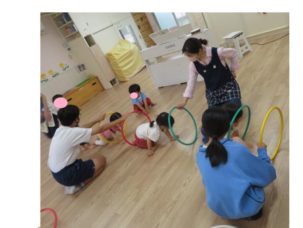 トライやるで来てくれている、お兄ちゃんお姉ちゃんと一緒に、床に置いたフラフープの輪の中にジャンプしたり、トンネルにしてくぐったり、音楽とともに体を動かし楽しみました♪