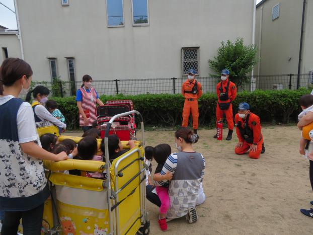 今日は、火災の通報、避難の様子を消防隊の方に見て頂きました。