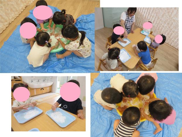 粉の時には"ふわふわ””サラサラ”に感触を楽しみ、少しずつ水を混ぜていき握って固めたり、もっと水を混ぜて”とろとろ”にしてみたり色々な感触を楽しんで遊びました。