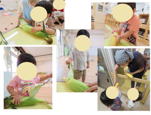 「トウモロコシだー」「これやる!」と嬉しそうに話していました。豪快にむく子もいれば、触るのもドキドキしながらむく子もいました。