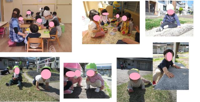 広場では歩いたり、四つ這いで移動したりと探索遊びを楽しんでいました。