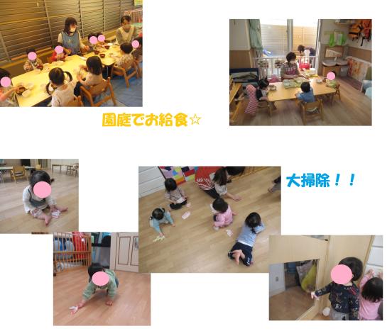 昨日は普通食のお友だちは園庭で給食を食べました。