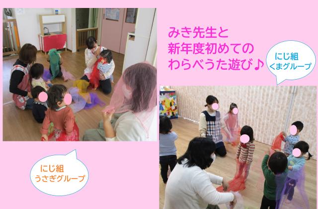 新年度になり、初めてのわらべうた遊びでした。みき先生に初めて会うお友達もいましたね♪