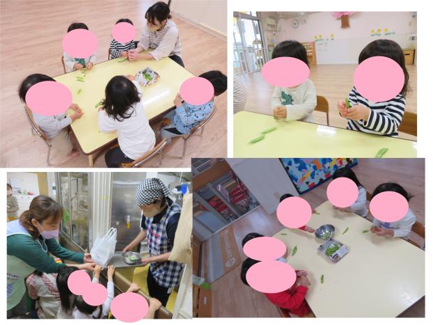 今日は、給食のお手伝いクッキング!旬の食材「うすいえんどう豆」のさやむきをしました。