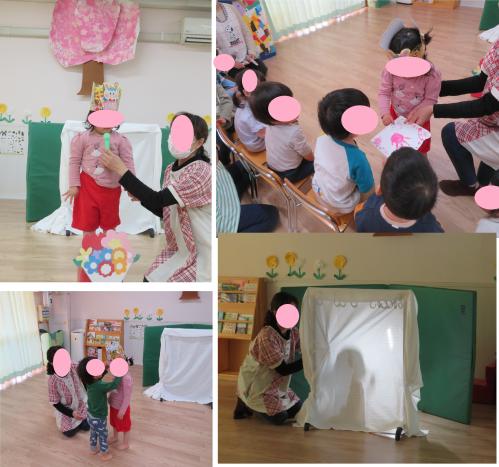 ピアノの音に合わせて手を叩いたり、体をユラユラ揺らす子ども達♪両手にギュッと握ったシフォン布をお花に見たてて咲かせてみたり、布を揺らしてちょうちょの歌を歌ったりと春を感じながら楽しみました。くまグループのお友だちは。リトミック遊びも楽しみました♪月に一度の会なのでこれからも楽しみです!