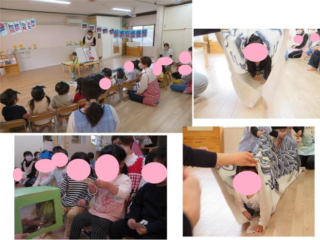 お友だちも順番にシルエットになって「だれかな?」クイズや「はたらくくるま」シアターで、ほし組にじ組みんなで楽しみました。
