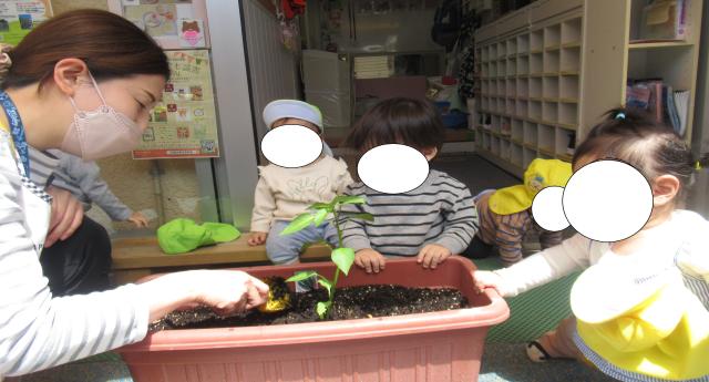 次年度に向けてじゃがいもをひよこグループさんで植えました。始めは、ジーとじゃがいもを見つめる子ども達でしたが、プランターを指差して「土の中にナイナイするんだよー」と、話すとコロンと入れてくれました。