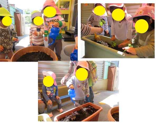 子ども達に種芋や野菜の苗を見せると指でツンツン、と触ってみる子、手にとって感触を確認する子と様々でした。苗を植えた後一人ずつお水をあげました。最後にみんなで「大きく育ってね~♪」の、おまじないをしました(^^)♪これからの成長が楽しみです!