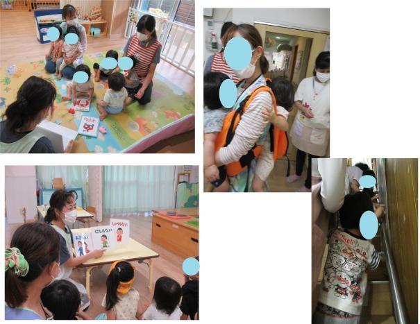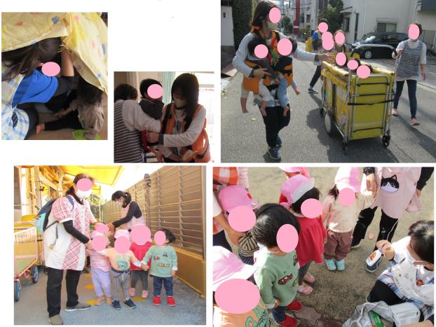 にじ組は、ちびっこ広場まで歩いて避難し、ほし組は、避難用抱っこ紐やおんぶ紐、避難車(散歩車)を利用して避難しました。