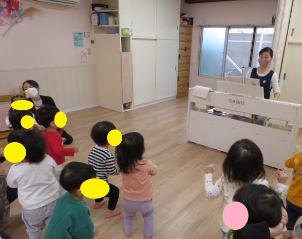 タンバリンを順番に叩いたり、手拍子をしたり、ハイハイしたり、体の部位をツンツンしたり、ピアノ演奏に合わせて沢山動いて笑って、とても楽しい時間でした。