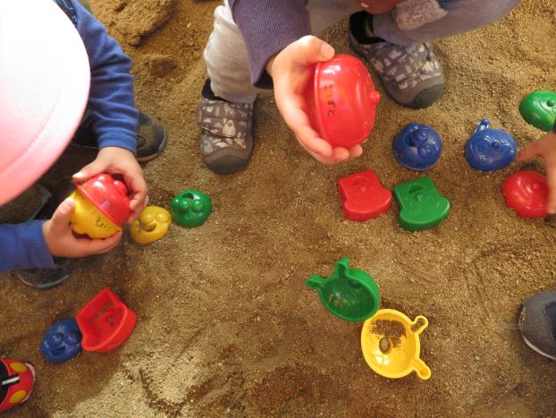 みんな砂場で型抜きでお砂をすくったり、型を抜いたり、並べたり、