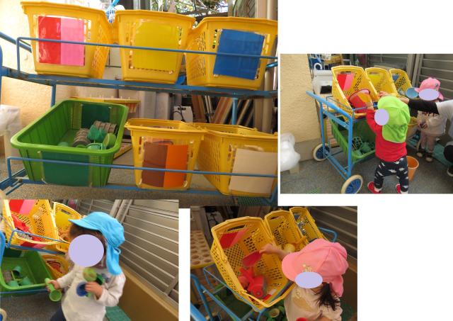 こばと保育園は、小さいお友だちの保育園なので「色分けにしてみよう!」ということでおもちゃの入れ方を変えました。