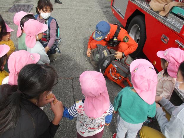 ちびっこ広場では、消火器を見せながら「これで、給食の先生や、園長先生が火を消すように頑張っています。」と、お話しするとよく聞いていました。