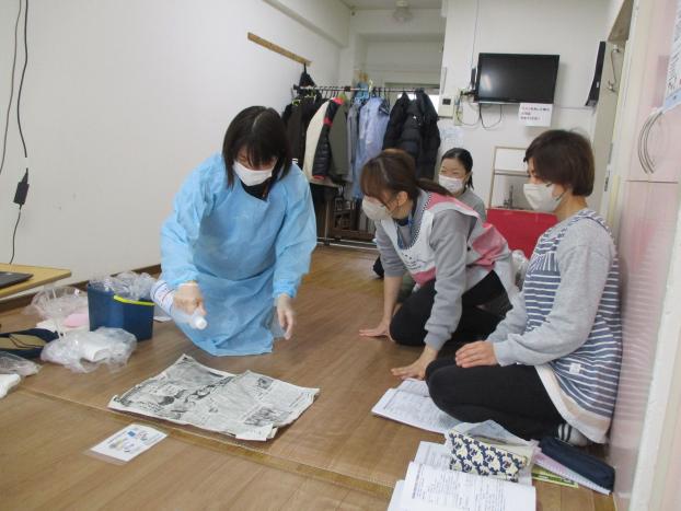 おう吐処理用セットのバケツを広げ、実際に起こった時のように実践しました。「手袋2枚マスク2枚使い捨てエプロンつけた後に、おう吐物に新聞被せて消毒かけるんだよね」「それじゃ遅いんじゃない?」など疑問を話し合いながら、素早く対処できるようにするにはどうしたらいいかな?と、話し合いが出来ました。