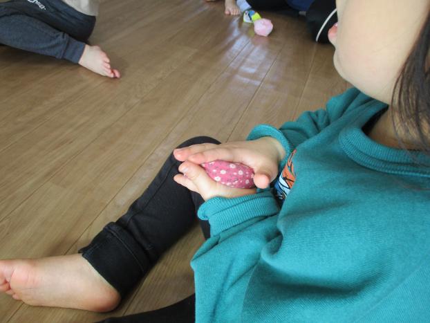 にじ組は、3つのグループに分かれて少人数で参加♪最初は緊張している様子でしたが、わらべうたが始まると思い出し一緒に楽しみました。「お手玉を頭にのせるのは?」と、リクエストもしていましたよ♪
