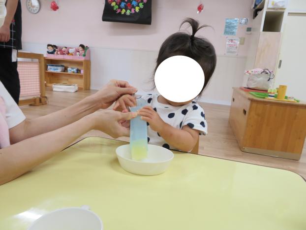 じっと見ているお友だち、ジップロックをわしづかみにして触るお友だち、指先でツンと触ってみるお友だち、と様々な様子でした。
