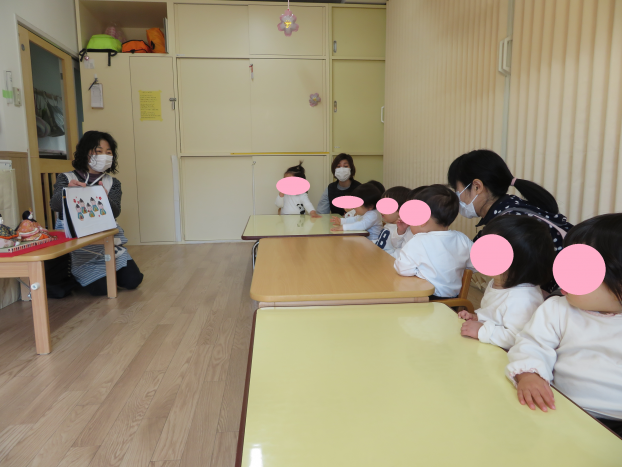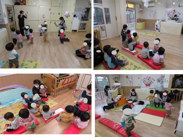 今日は、わらべうたの先生が来て下さり、うさぎグループとひよこグループのお友だちが参加しました。