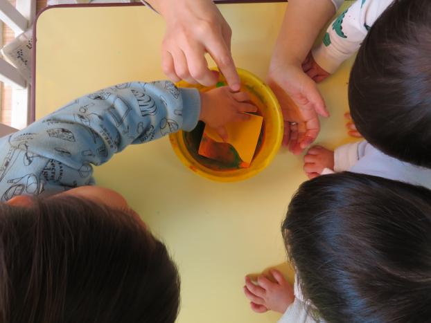 お花紙の感触ににこっとするお友だち、不思議そうに紙を見るお友だち、眉間にしわを寄せて見るお友だちと様々な反応を見せてくれました。