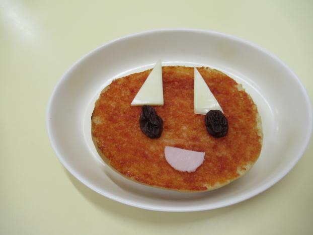 調理室の先生がパンにケチャップを塗ってくれ、そこに目(レーズン)、角(チーズ)、口(ハム)をつけて自分だけの鬼の子パンを作りました!端から大事そうにかじりながら食べる子、乗せていた具材から食べる子と様々。みんな「おいしーい♪」と、嬉しそうに食べていました。