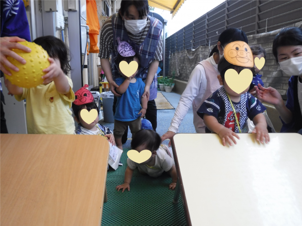 今日は、待ちに待った夏祭りの日♪こども達は「お店屋さん楽しみ♪」と、朝からワクワクした様子でした!お祭りでは、保育士からのお楽しみ会があったり、アンパンマンの盆踊りを踊ったりしました。お店屋さんでは、ボール転がしやお面屋さん等、どれも楽しんでいましたよ♪