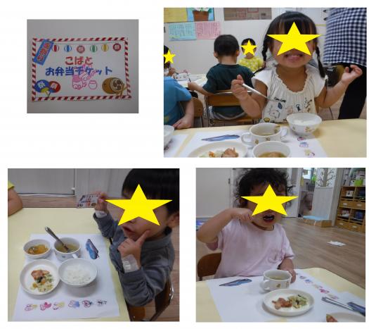 お昼ご飯は、給食室の先生がお弁当屋さんになってくれ、くま組さんはチッケトを渡してお弁当と交換してもらいました。みんな嬉しそうに食べていましたよ!(^^)!