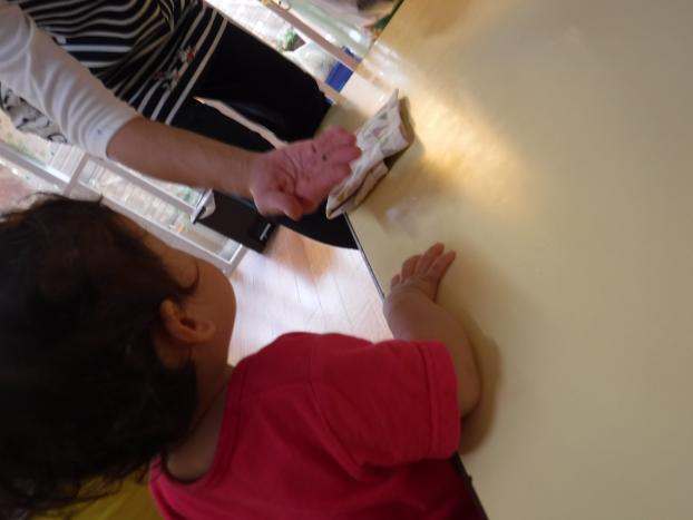 ドア越しにひよこ組さんと給食室の先生にも見てもらいました。