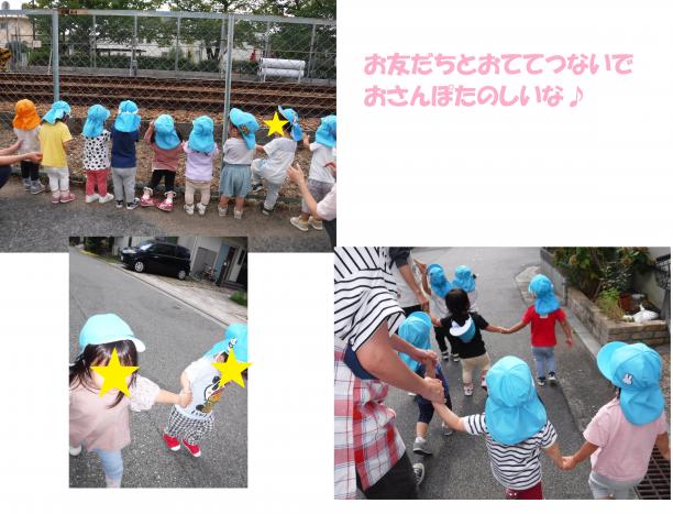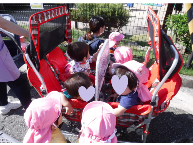 登園してからご機嫌で手作りTシャツを着て、出発の準備もみんなはりきってしていましたよ♪路地裏をお友だちと手をつなぎながら上手に歩き、ちびっこ広場で虫探しや滑り台を楽しみました。ちびっこ広場につくとぽっぽ保育園に来ていた消防車見学の車が止まっていて大喜びで見ていました。