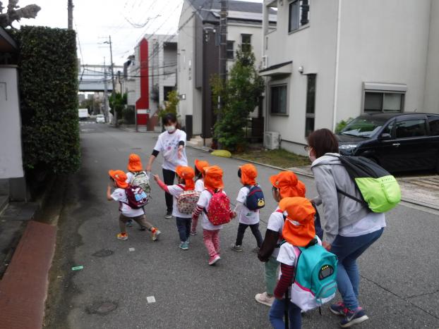 保育園周辺をお散歩して、草花に触れたり、落ち葉を拾ったりしました。