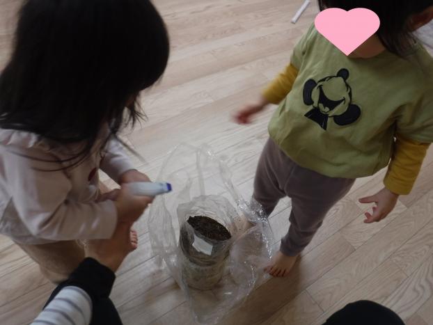 「じゅんばん」と言いながら霧吹きを待っていたり、きのこの歌を一緒に歌ったりしながらきのこが生えてくるのを楽しみにしています☆