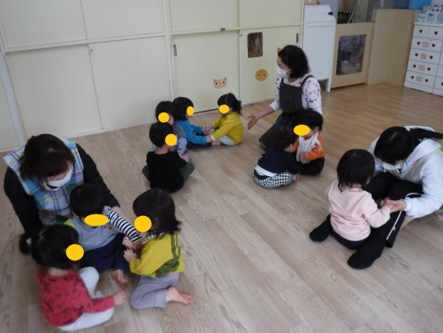 保育士が歌をうたうと子どもたちが二人組、三人組になり手を繋ぎはじめました。