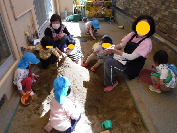今日で今年度も最後となりました。お庭で砂遊びを楽しみました。保育士が砂の山を作るとみんな優しくトントン・・と、砂を叩いて一緒にお山作りをしてくれました。あんまりにも大きくて山に登ろうとする子やトンネルを掘ろうとする子もいましたよ。みんなで遊んだ楽しい時間でした♪