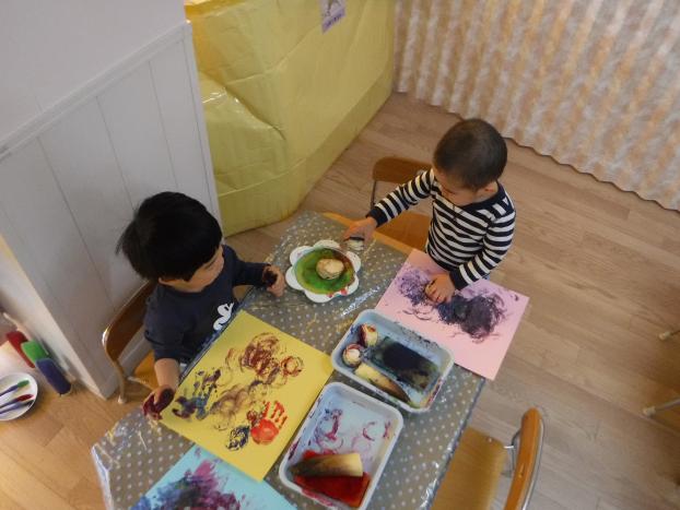 手についた絵の具を不思議そうにみるお友だちや画用紙に絵の具がつくと