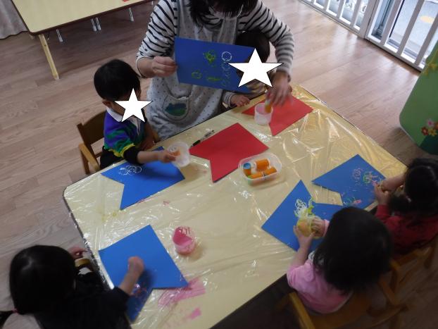昨日、子ども達と筍の皮むきをしました。今日はその筍でスタンプをしてこいのぼり制作をしました。筍の丸い形を見て「わ~!」と、嬉しそう♪色選びも楽しくて「青にしようかなぁー♪」「次は赤!」と次々とスタンプをしていました。