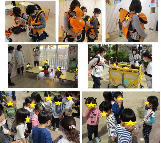 ひよこ組は、2人用、3人用の避難用おんぶ紐を使いました。落ち着いて装着できるようにと日々使い方を練習していこうと話し合いました。