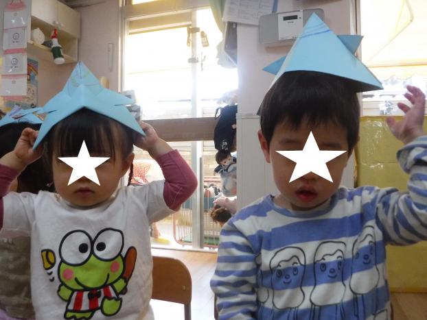 みんなでこいのぼりの歌を歌った後、先日お絵描きして作った兜をかぶったり、菖蒲の葉を頭にまいたりしました☆