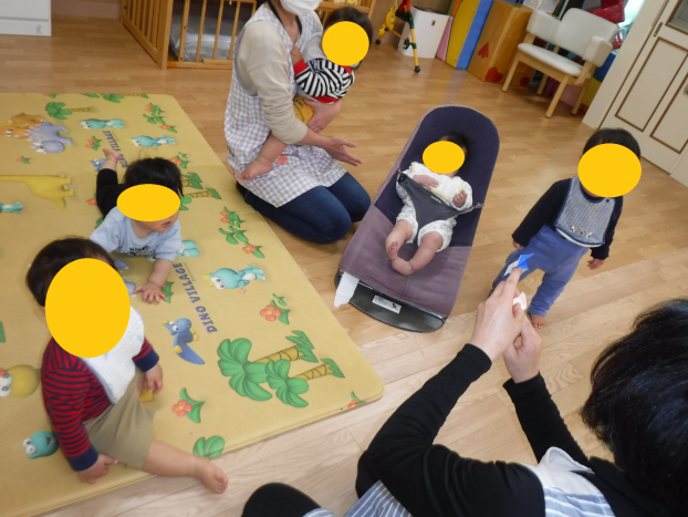 新しい環境でまだまだ緊張した表情のお友だち、寂しくって泣いて抱っこのお友だちがいますが少しづつ笑顔もみせてくれるようになりました☆