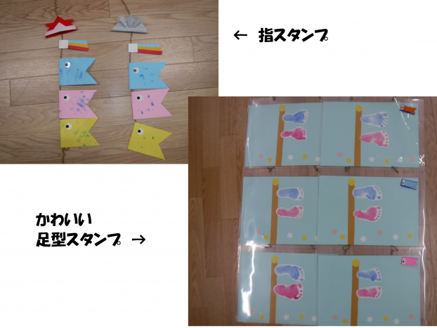 おみやげに、指スタンプでつくったモビールこいのぼり、折り紙指人形こいのぼりを持って帰りました。おうちの人と楽しんでね。