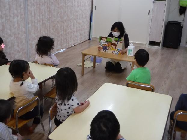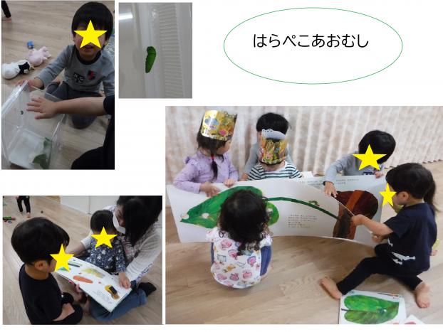 「はらぺこあおむし」のCDを聴きながら、みんなで「はらぺこあおむし」の絵本を楽しんでいます。
